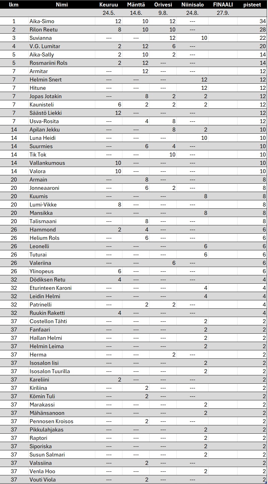 Paikallisravien tiedot ovat alustavat ja muutokset ovat aina mahdollisia! Erinäiset syyt voivat aiheuttaa ravien siirtämisen tai peruutuksen. Sarjat ja lähtölistat julkaistaan Heppa-järjestelmässä.