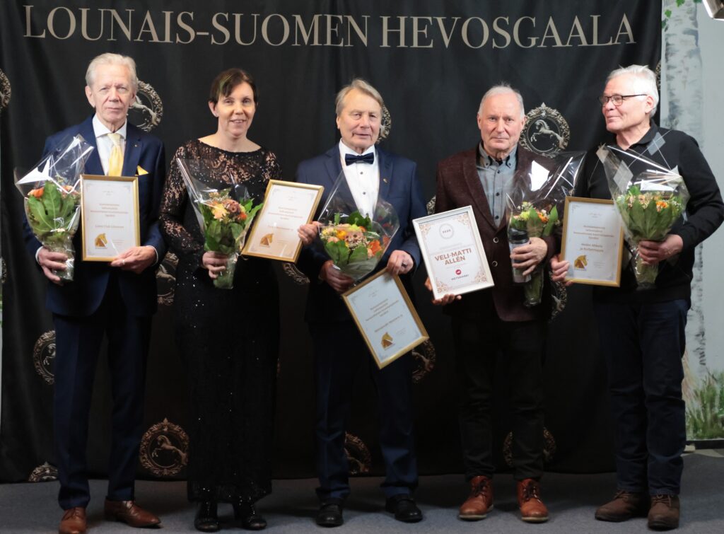 Lounais-Suomen Hevosgaalassa Varsinais-Suomen Hevosjalostusliitto muisti kunniatauluin hevosaiheisen koululaispäivän talkoolaisia. Kuvassa Littoisten Lions Clubin edustaja Seppo Ilmanen, Turun Ravinaiset ry:n puheenjohtaja Päivi Satto, Metsämäki Mastersin puheenjohtaja Jarmo Virtanen, Metsämäen raviradan palkitsema Veli-Matti Allen ja Heikki Mikola, joka suomenhevostamma Kullannupun kanssa on ollut mukana koululaispäivässä jo kahdeksan kertaa.