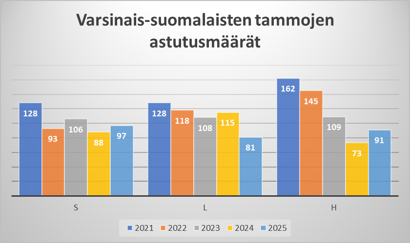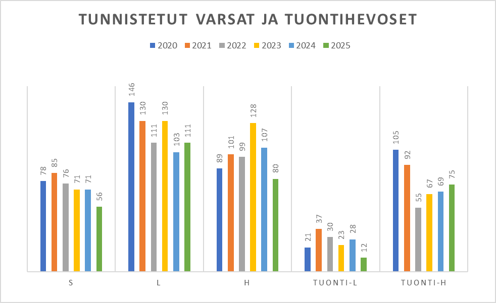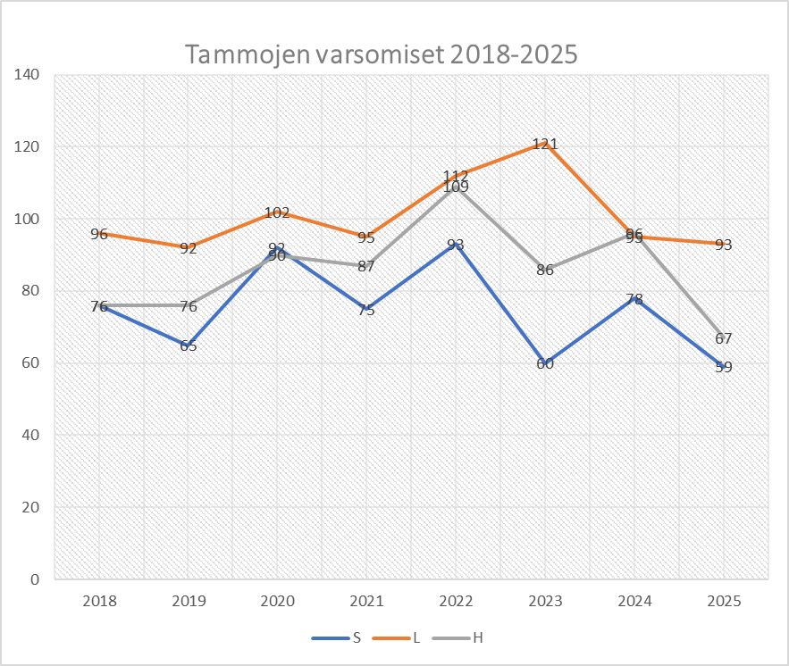 Vuonna 2025 tammamme varsoivat seuraavasti: suomenhevosia 59 (78), lämminveriravureita 93 (95) ja ratsuja ja poneja (H-rekisteri) 67 (90). Oheinen taulukko kertoo väliaikaisesta laskusuunnasta, joka peilautuu luonnollisesti koko suomalaisen yhteiskunnan talouskasvun pitkittyneeseen taantumaan.